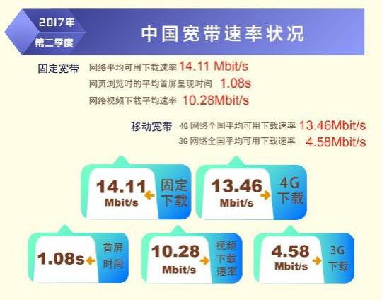 日前,寬帶發(fā)展聯(lián)盟發(fā)布了第 16 期《中國寬帶速率狀況報告》(2017 年第二季度)。報告顯示 2017 年第二季度我國固定寬帶網(wǎng)絡(luò)平均下載速率達(dá)到 14.11Mbit/s,比 2017 年第一季度提高了1.1Mbit/s,同比去年第一季度提升了 34.8%。自 2015 網(wǎng)絡(luò)“提速降費”工作開展以來,我國固定寬帶可用下載速率連續(xù) 10 個季度持續(xù)提升,總提升幅度達(dá)到 3.3 倍。同時,我國移動寬帶用戶使用 4G 網(wǎng)絡(luò)訪問互聯(lián)網(wǎng)時的平均下載速率達(dá)到 13.46Mbit/s,環(huán)比 2017 年第一季度也有 14.2%的提升。