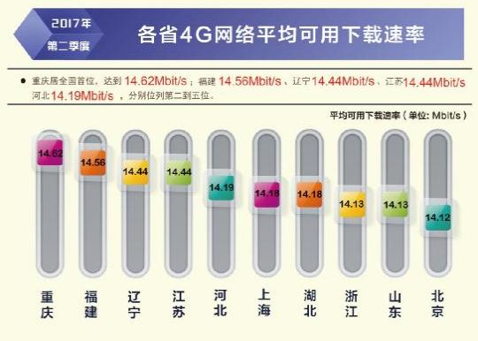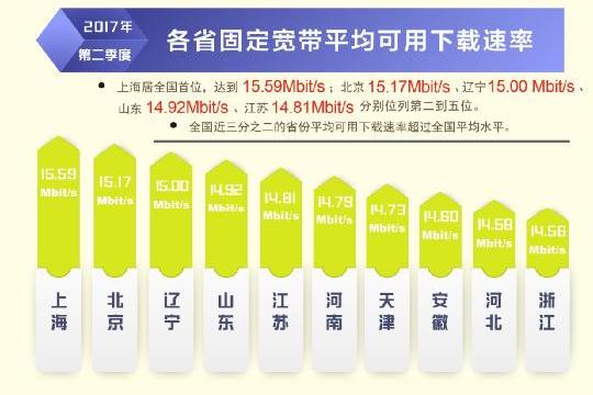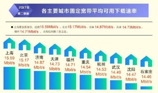 根據(jù)本次報告,除西藏自治區(qū)外,全國其他所有省級行政區(qū)域固定寬帶平均下載速率均超過 12Mbit/s,上海、北京、遼寧率先超過或達(dá)到了 15Mbit/s,位列全國前三,山東、江蘇緊隨其后。在直轄市和省會城市固定寬帶下載速率排行榜上,上海、北京、濟(jì)南、天津、福州位居前五位。從移動寬帶網(wǎng)速狀況看,重慶、福建、遼寧、江蘇、河北的 4G 網(wǎng)絡(luò)用戶下載速率排在全國省級行政區(qū)前五位;不同電信運營企業(yè)中,中國聯(lián)通的 3G 網(wǎng)絡(luò)用戶下載速率和 4G 網(wǎng)絡(luò)用戶下載速率均最高,分別達(dá)到 5.20 Mbit/s 和 15.05 Mbit/s。